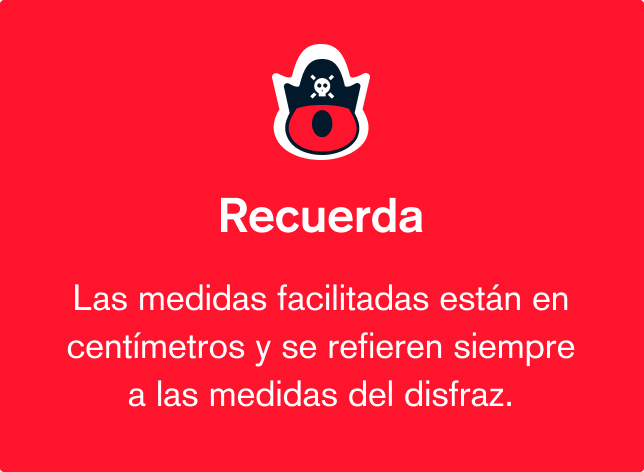 Nuestros productos están confeccionados por diferentes fabricantes que utilizan distintos tejidos, patrones y remates; lo que puede influir en la talla de cada disfraz. Por ello, aconsejamos consultar las medidas de cada modelo en su ficha, para realizar una compra segura.Si después de consultar las medidas, aun te surgen dudas, puedes contactar con nosotros, estaremos encantados de ayudarte.