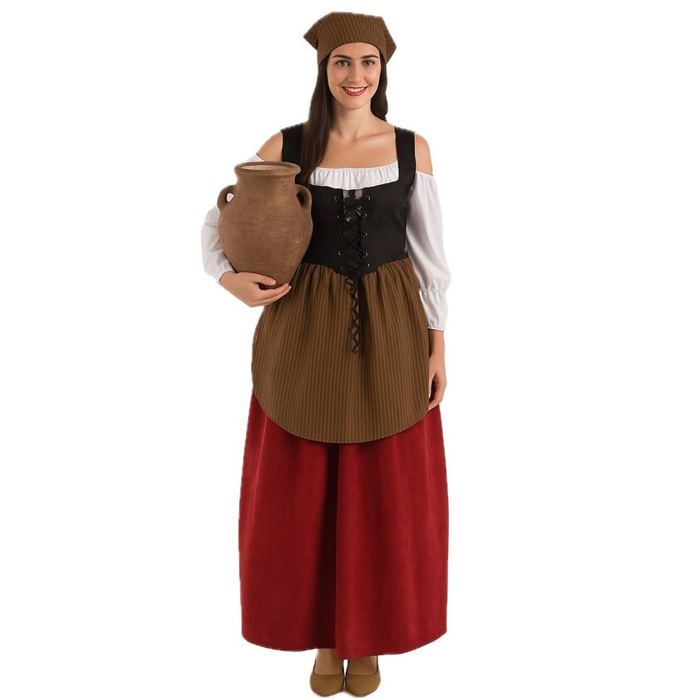 Los Disfraces Medievales de mujer quedan favorecedores vayas de campesina, mesonera o tabernera. El Delantal y el pañuelo de cabeza son los complementos más identificativos de este modelo.