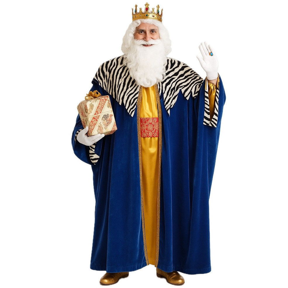 Las Cabalgatas de los Reyes Magos este año serán más llamativas y elegantes. Elige este modelo de Melchor y aporta un look más atrevido, pero sin perder la vestimenta clásica de túnica con abrigo largo.
