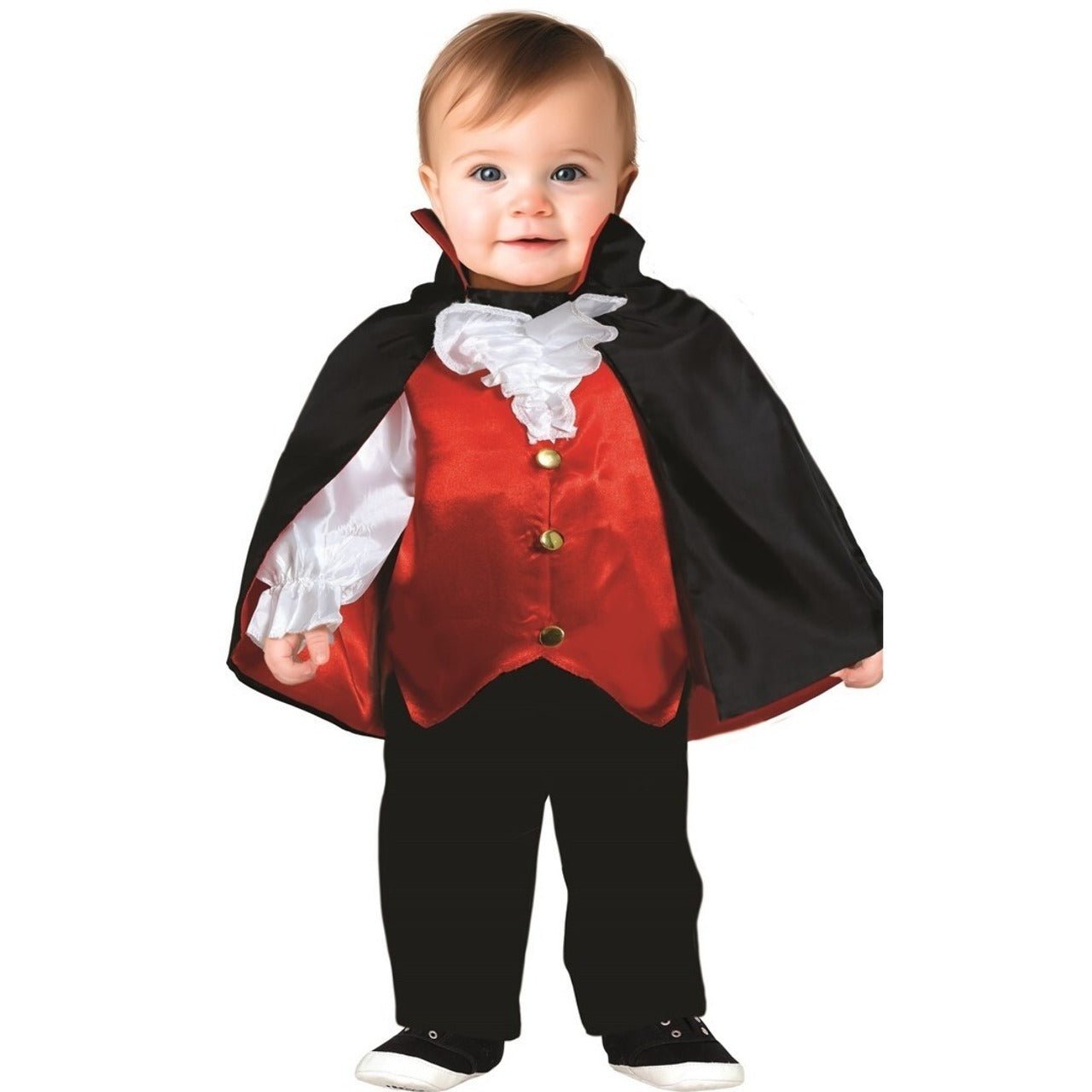 Disfraz de Vampiro Refinado para bebé para Halloween y Carnaval. Viaja a Transilvania y visita el castillo de Drácula, donde vivirás eternamente entre ataúdes y ultratumbas. Para tus fiestas de Halloween elige el disfraz de vampiro y vampiresa, un clásico que siempre triunfa.