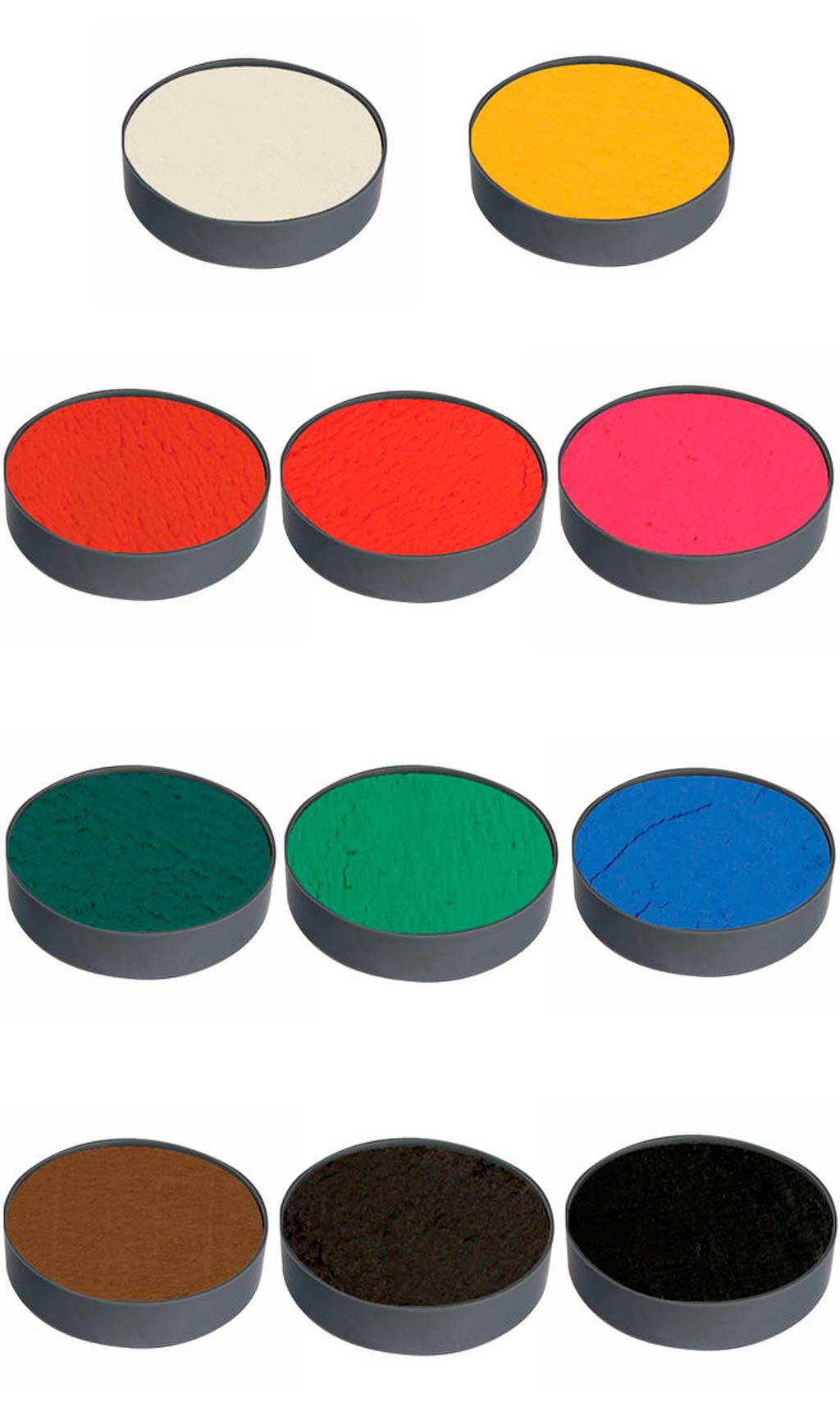 Base: Water Make-up (Pure) se puede aplicar directamente en la piel, pero también puedes aplicar una capa de Maquillaje Cake Blanco. Esto tiene el beneficio de permitir que los colores se apliquen más uniformemente, sean más vivos y también que se quiten más fácilmente. El Maquillaje Cake se seca rápido y no se mezcla con los colores de maquillaje al agua. Todos los colores se pueden mezclar entre sí. Elige el más ideal para caracterizar a tu personaje o combinar con tu disfraz.