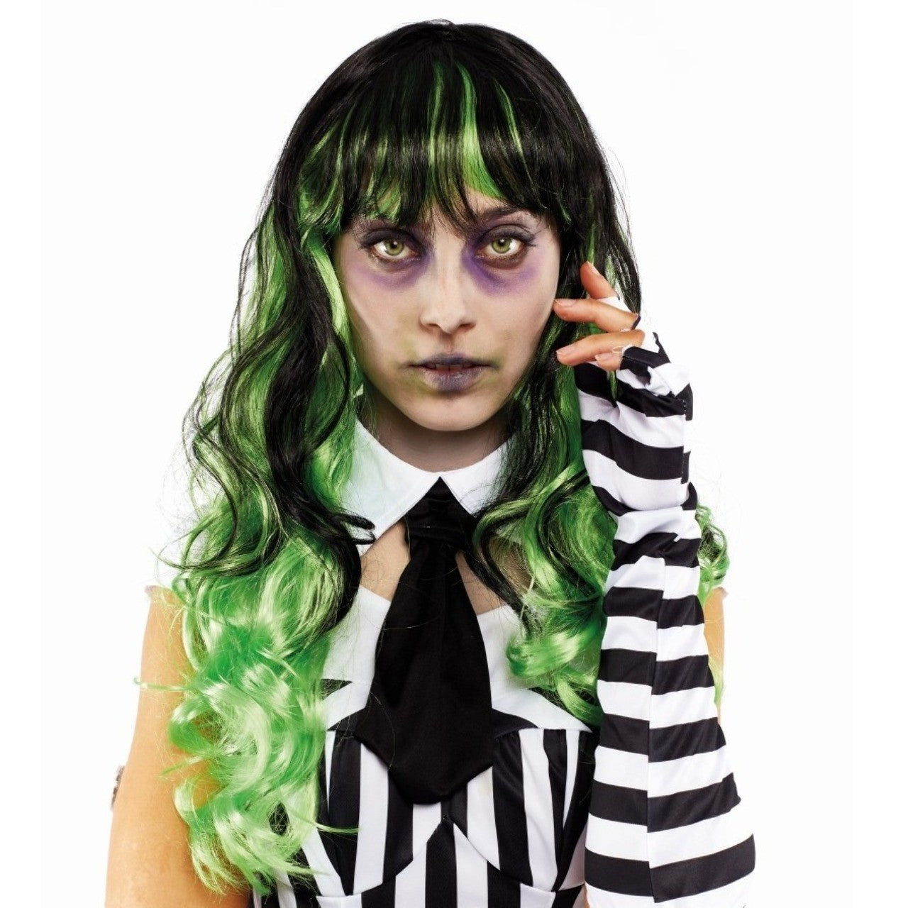 Peluca Verde y Negra Siniestra para Halloween. Visita nuestra colección de complementos de Halloween para tus fiestas en la noche de muertos, pasarás una noche de terror a camino entre la vida y la muerte. Haz tu pedido ahora y recibe en 24 horas.