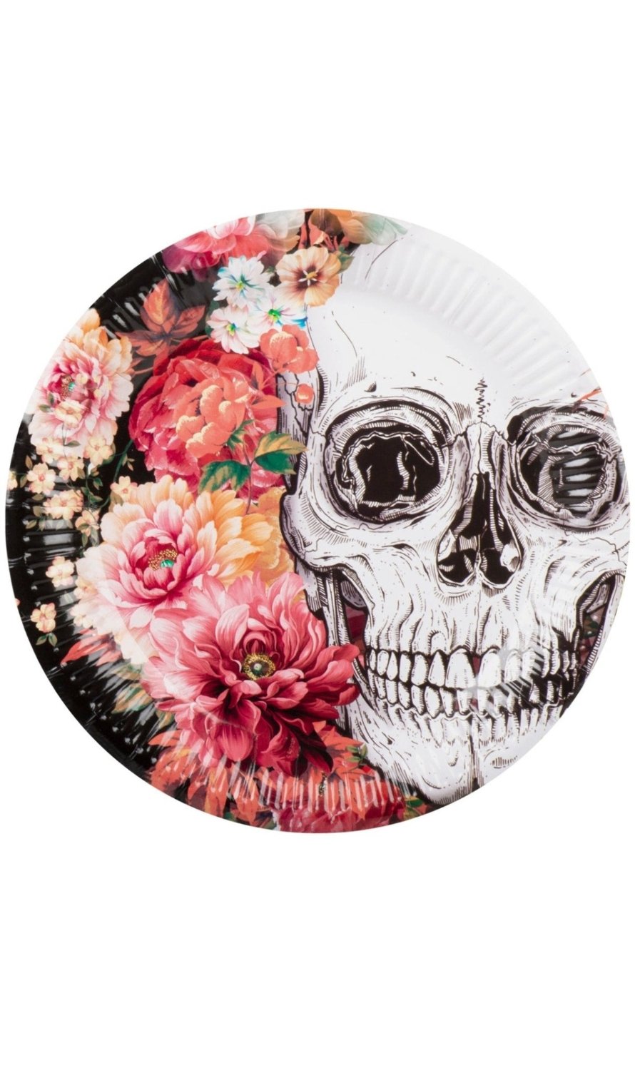 Platos de Catrina Flores para Halloween. Visita toda la colección de complementos disfraces y decoración Halloween para fiestas en la noche de muertos, pasarás una noche de terror entre vivos y muertos. Haz tu pedido ahora y elige platos, vasos, manteles, candelabros, calaveras, calabazas, guirnaldas, telaraña. Y mucho más.