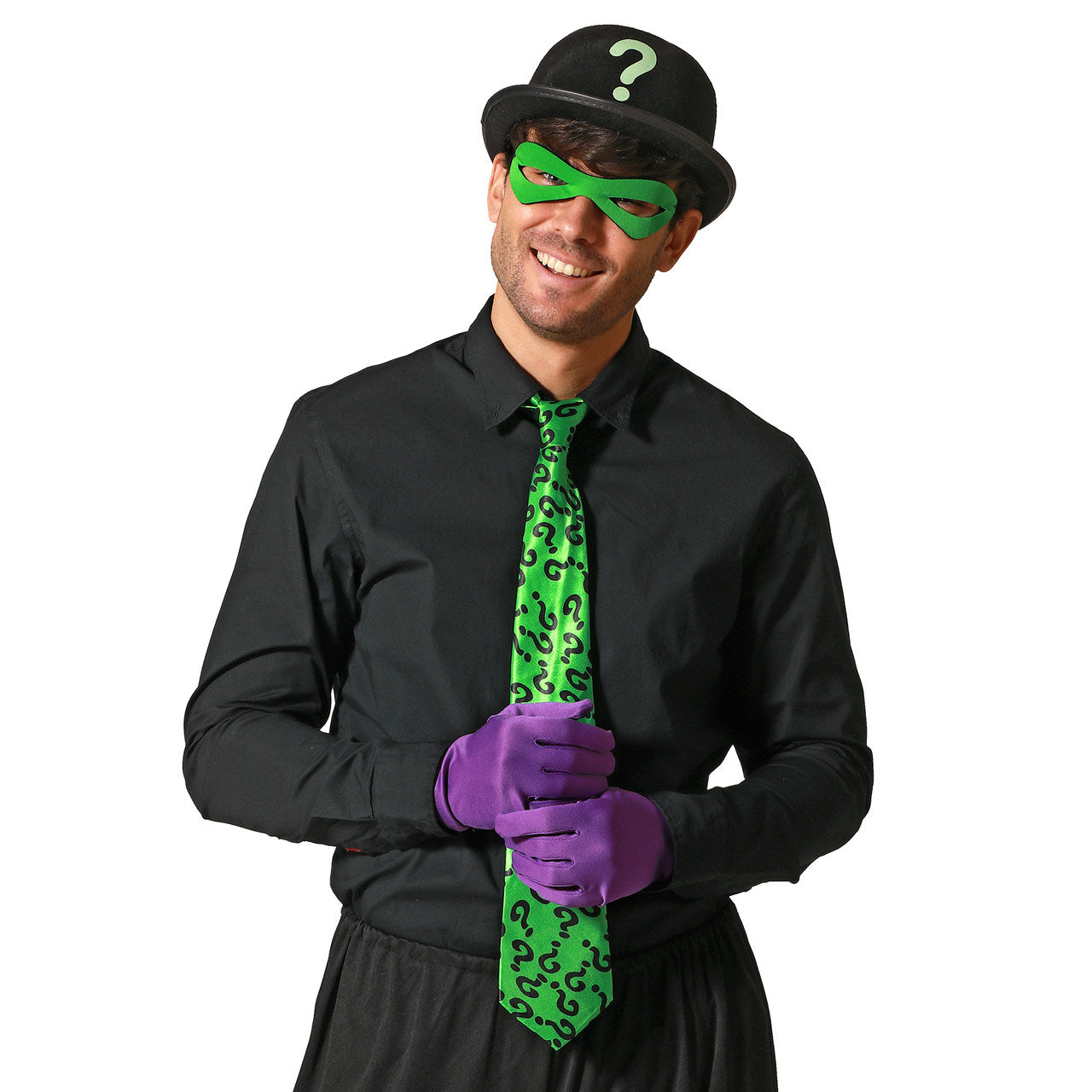 Set de Supervillano Enigma para triunfar en carnaval y fiestas de disfraces. Todos soñamos con ser superhéroes por un día, con nuestros complementos y disfraces, podrás elegir que superpoder prefieres. Para tus fiestas de carnaval compra disfraces y accesorios de superhéroes en nuestra tienda online.
