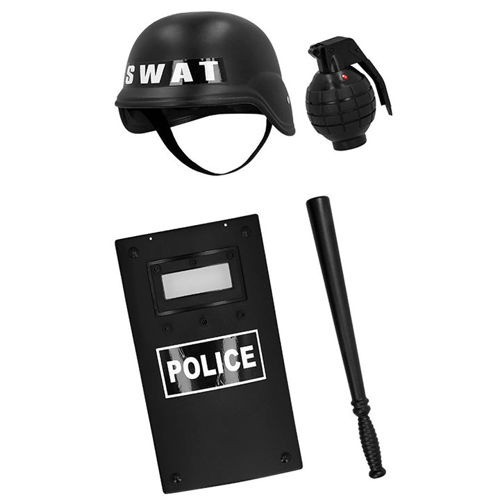 Set de Swat infantil para carnaval y fiestas de disfraces. Si quieres formar parte de los cuerpos especiales que nos protegen a diario, elige entre nuestros disfraces y complementos los que más te gusten para convertirte en un valiente policía, militar, soldado o guardia civil. Elige tu disfraz del cuerpo de seguridad con sus accesorios y haz tu pedido. Mejor servicio online.