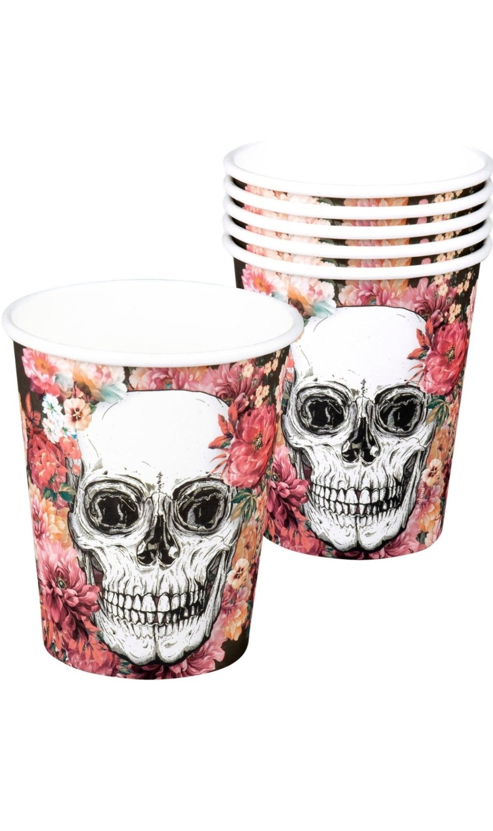 Vasos de Catrina Flores para Halloween. Visita toda la colección de complementos disfraces y decoración Halloween para fiestas en la noche de muertos, pasarás una noche de terror entre vivos y muertos. Haz tu pedido ahora y elige platos, vasos, manteles, candelabros, calaveras, calabazas, guirnaldas, telaraña. Y mucho más.